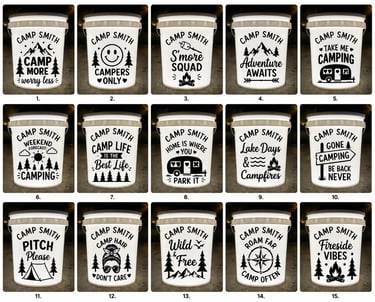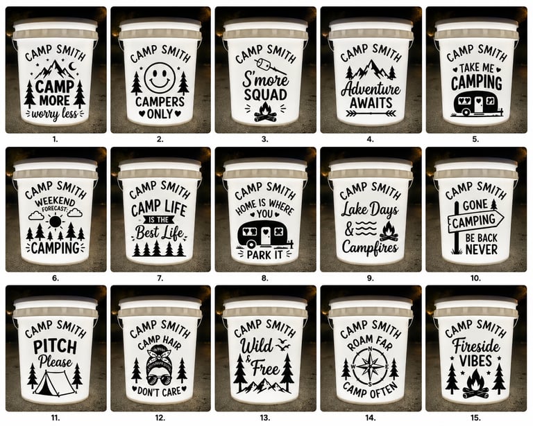 Family names (ex: Camp Smith), lake names, or fun camping graphicsFishing Buckets
